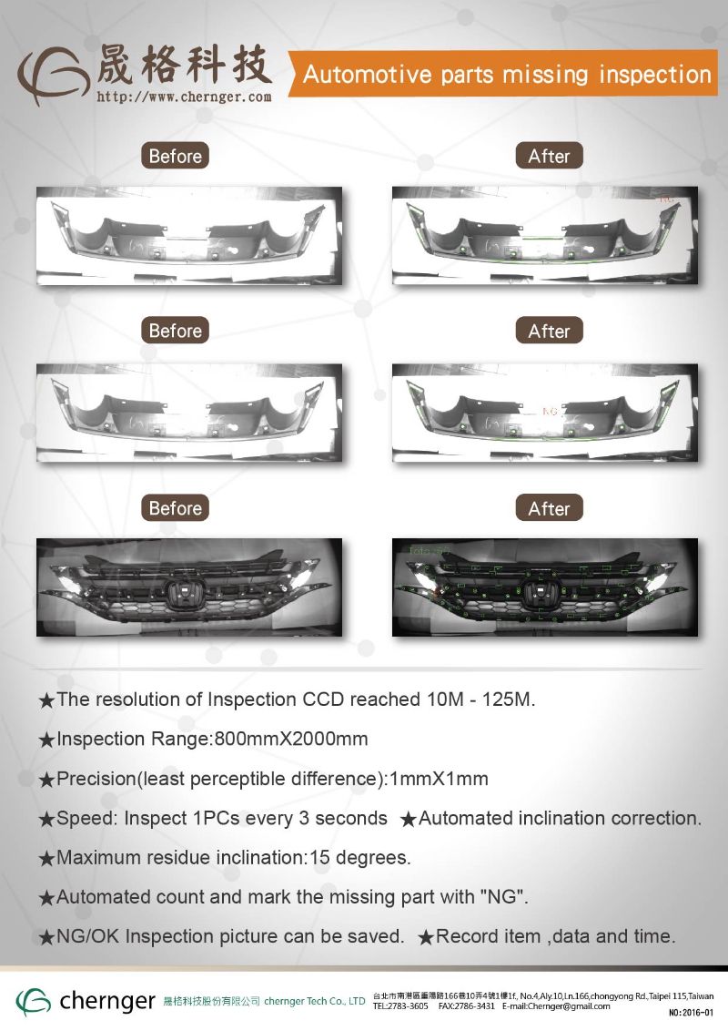 Automotive Components Home E Applications E Product E Automotive Components Automotive Dashboard Inspection 檢測項目:凸點、毛邊 Download Automotive Components Inspection 檢測項目:漏裝 Download Car rearview mirror AOI Machine 檢測項目:邊緣破裂 Download Car Armrest Inspection 檢測項目:凸點、凹陷 Download Automotive Seat Belt Inspection 檢測項目:汙染、缺線、鬆散、毛邊、水漬等 Download