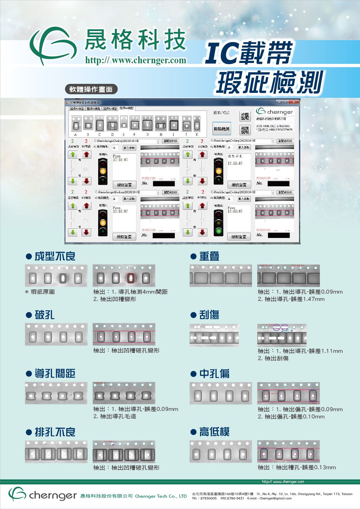 - Defect Inspection Capability: for 6 types of carrier tapes (P2, F, E, P0, X0, and Y0). Data archiving by maximum, minimum, and average.